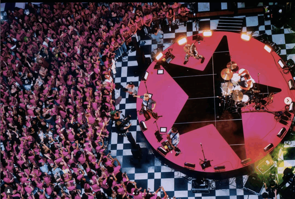 A free pop-up event at Sunset Boulevard in West Hollywood saw the band play unreleased songs from the upcoming album, including “Star”, “Boyband”, “Telephone Busy” and “No.1 Obsession”. We have won in every way, and we barely know it yet. Not only new songs, the boys of 5 Seconds of Summer rocked up to the event in a pink Y2K themed pink limousine, performing on a star elevated platform surrounded by black-and-white checkered print. And their looks? Well, let’s just say the band have taken their album cover quite literally, matching the feel of the outfits to a key. Think spikey, gelled hair, coloured hair for Michael (if you know, you know), leather jackets, eyeshadow and metal chains- that is the re-cap of both the event and, hopefully, the entire album roll-out.