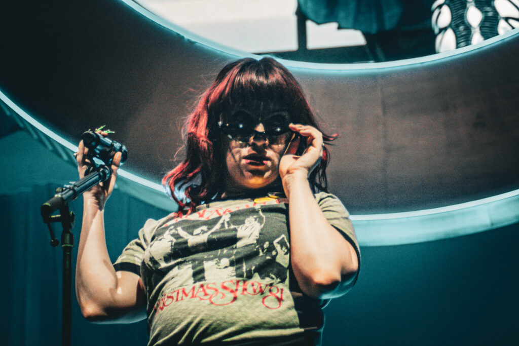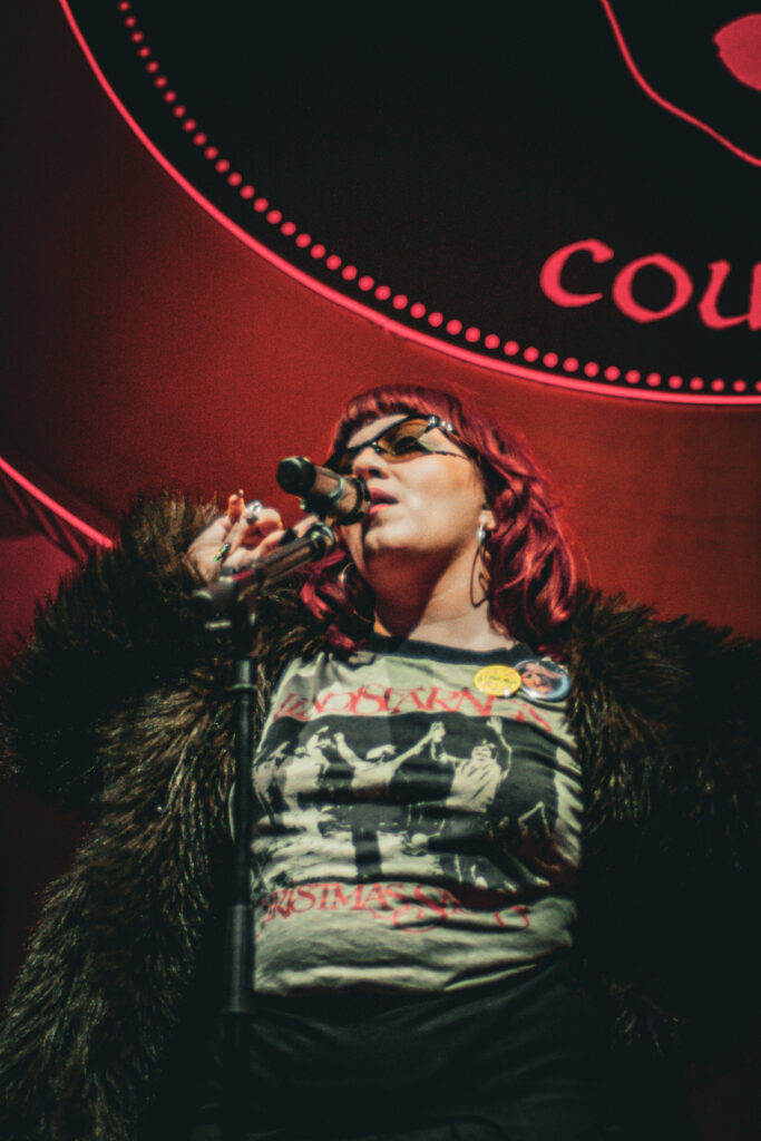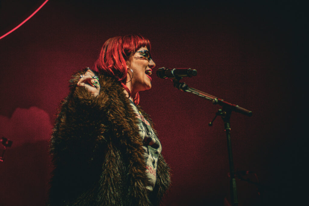 The ‘very sexy CMAT band’ are on the stage at 9 pm. The starting tune of “Janis Joplining” is playing out of the speakers. But there is no CMAT in sight. Suddenly, the first lyrics “I’m a writer” play out, and a spotlight lands on CMAT on the balcony – adorned in a fur coat, looking out at the crowd. She sings the rest of the song from the balcony, then the lights go down; when they come back up, CMAT has joined the rest of her band on stage. This was the perfect chaotic entrance to match her just as chaotic show.