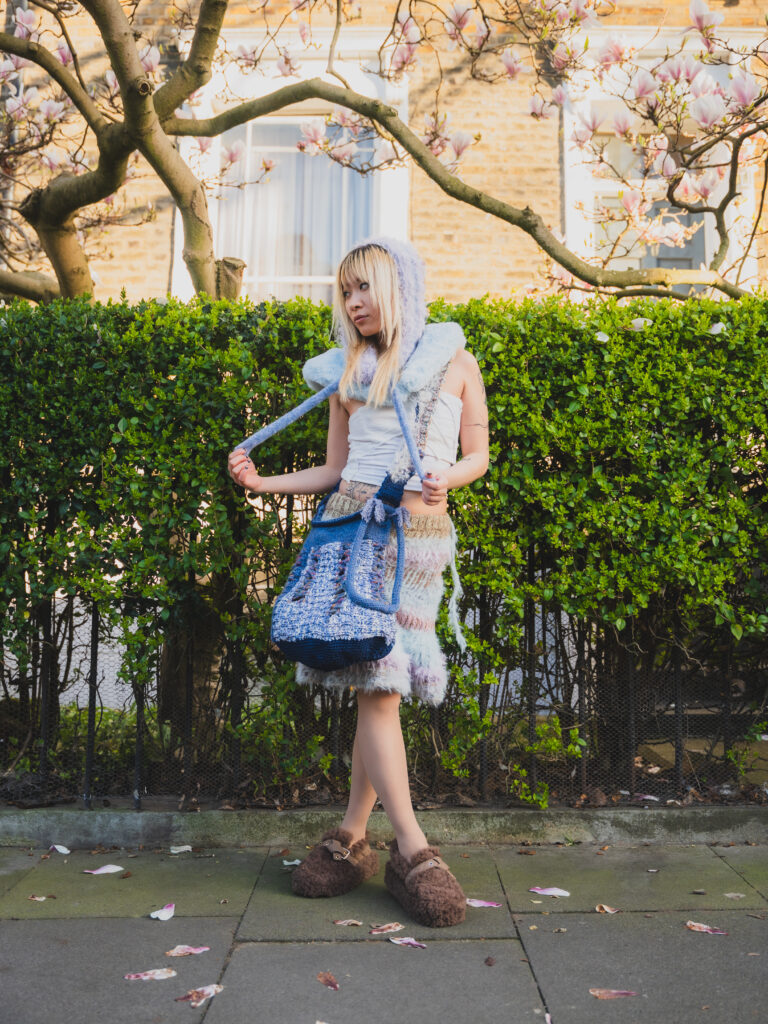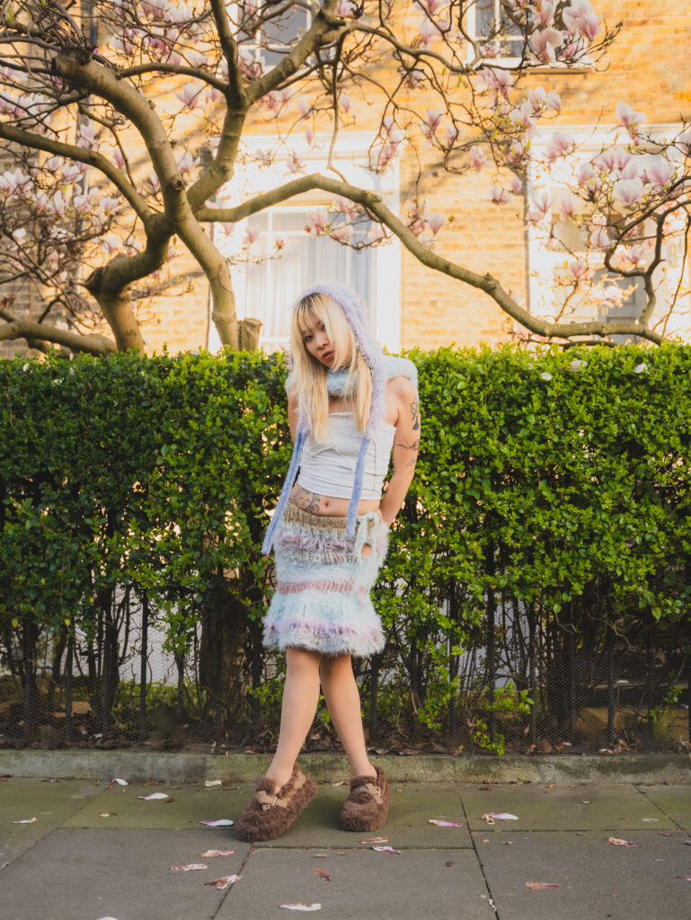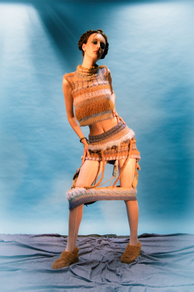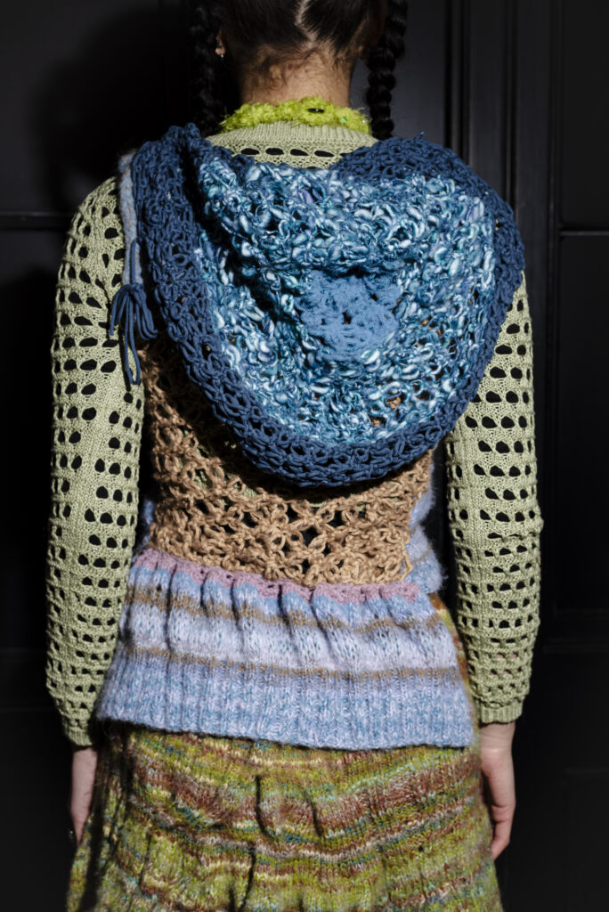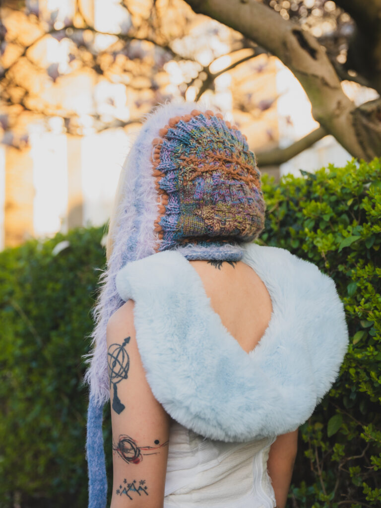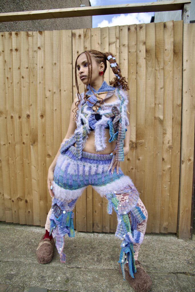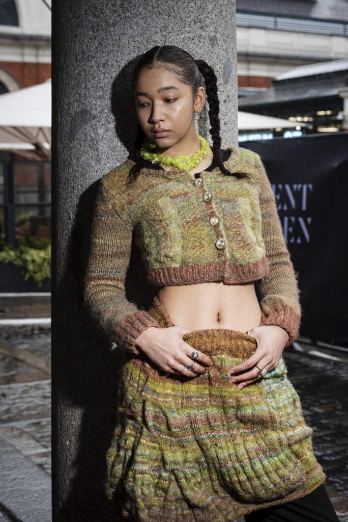 Kye’s experimental, gender-fluid pieces feature tactile silhouettes. These intertextually manifest the brand’s artisanal approach, embodying their slow-fashion aesthetic while creating a dreamlike vision of nostalgic street style. These gentle silhouettes have proved flattering on gender non-conforming bodies such as 2024 Eurovision winner Nemo, who recently wore pieces from her collection. Nemo is a fitting model for such expressive and colourful pieces with a femme aesthetic, and their ability to perform comfortably in “THE ARMOURER” is a testament to the mission of the designer; to create wearable pieces of art. The garments, which are crafted with elasticated finishings, have the capacity for inclusive sizing, and I look forward to seeing her exhibit looks on models with more diverse dress sizes in the future.