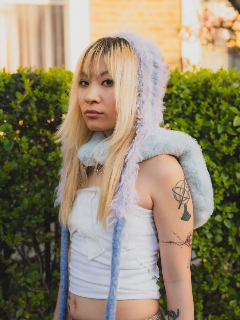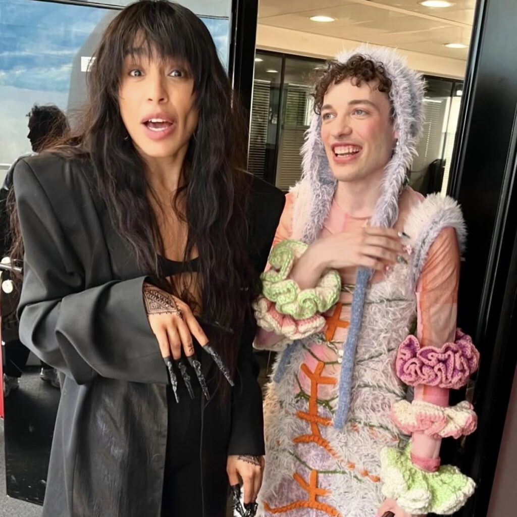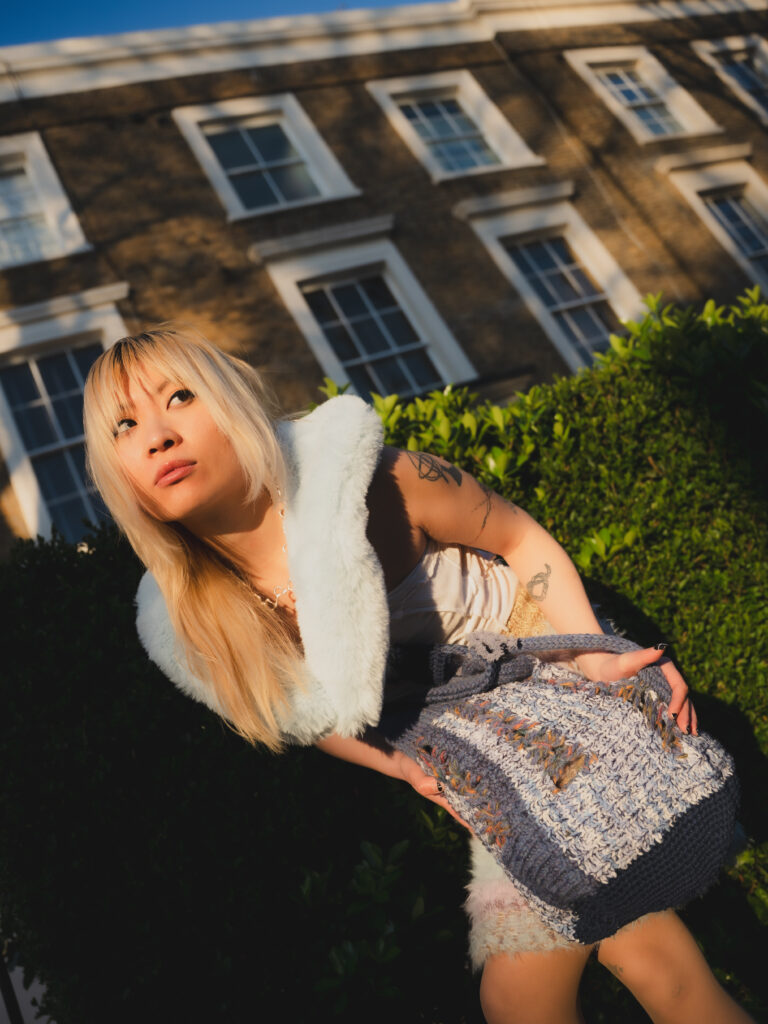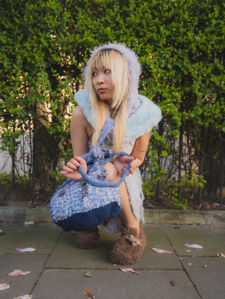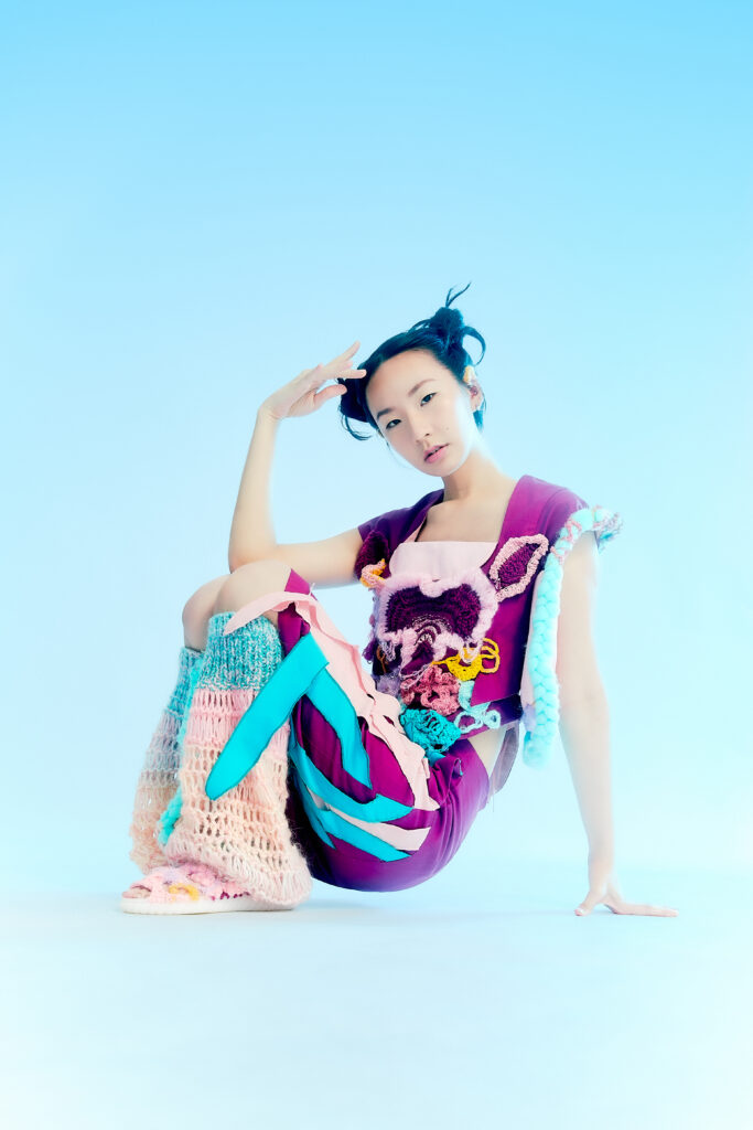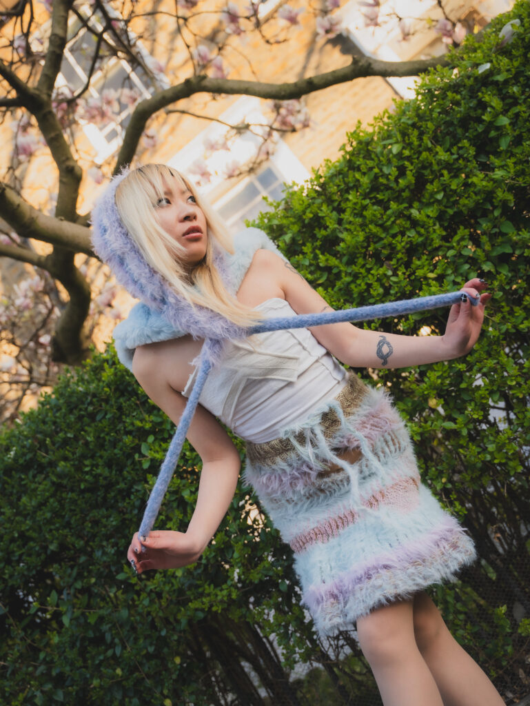 Kye’s experimental, gender-fluid pieces feature tactile silhouettes. These intertextually manifest the brand’s artisanal approach, embodying their slow-fashion aesthetic while creating a dreamlike vision of nostalgic street style. These gentle silhouettes have proved flattering on gender non-conforming bodies such as 2024 Eurovision winner Nemo, who recently wore pieces from her collection. Nemo is a fitting model for such expressive and colourful pieces with a femme aesthetic, and their ability to perform comfortably in “THE ARMOURER” is a testament to the mission of the designer; to create wearable pieces of art. The garments, which are crafted with elasticated finishings, have the capacity for inclusive sizing, and I look forward to seeing her exhibit looks on models with more diverse dress sizes in the future.