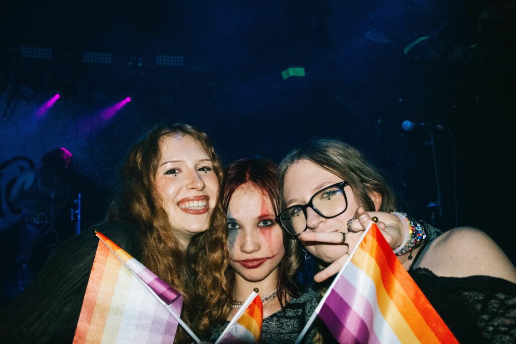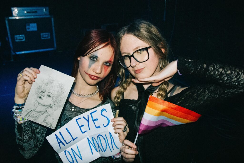 Nxdia didn’t just own the stage – they left it, multiple times, dancing in the pit with fans, hugging them, laughing, crying. The venue turned into a celebration: people waving flags, gifting bracelets and drawings, dancing freely. Fans showed up in matching makeup looks inspired by Nxdia’s iconic looks, making the whole night feel like a runway, rave, and reunion rolled into one.