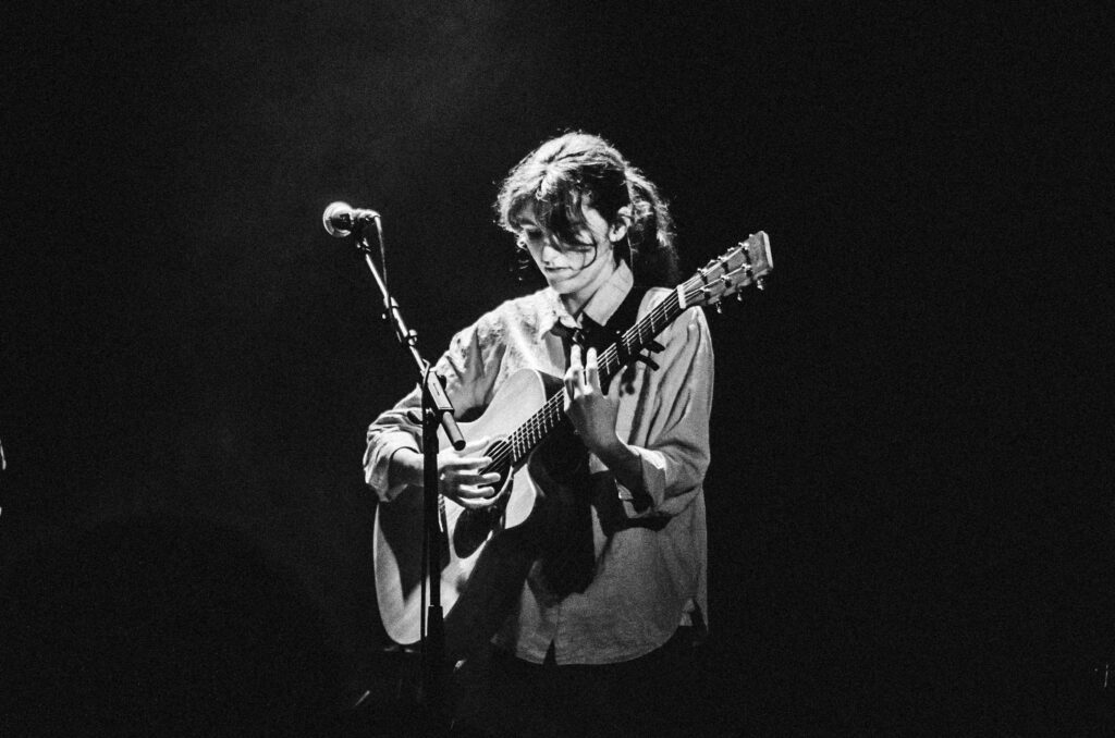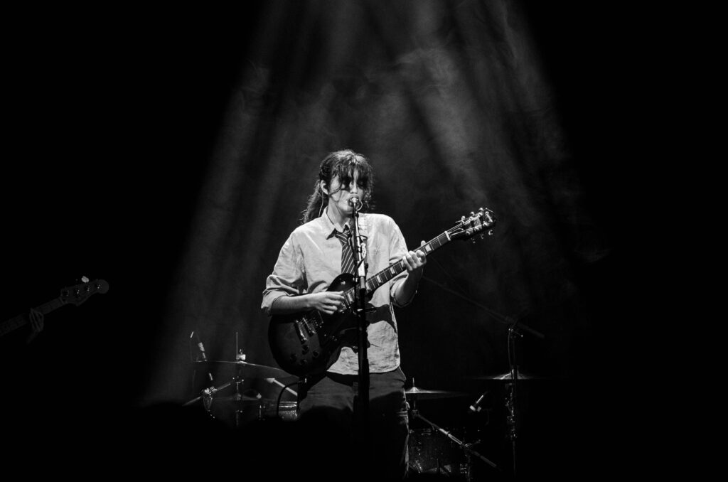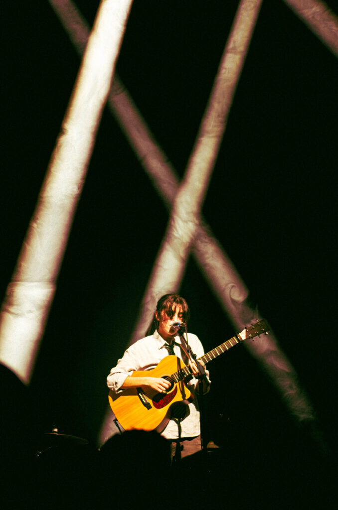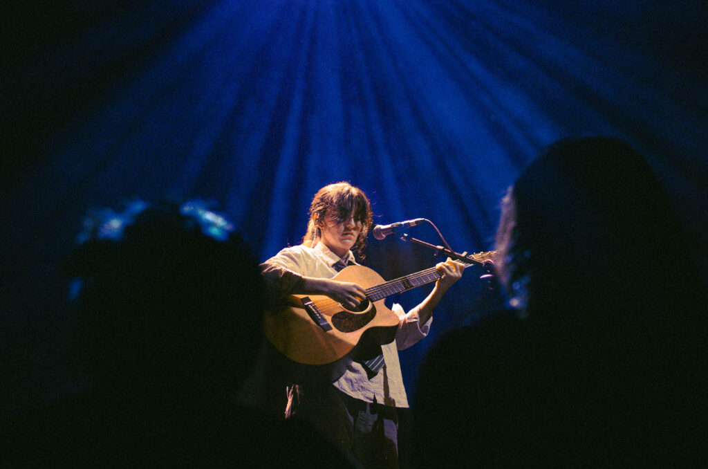 Between Falzon’s set and Duckart’s headline show, it is clear the audience is anxiously waiting for his arrival. Every movement on stage (from a flicker of a curtain to someone in the team laying down a set list) is met with hurried gasps and sequestered screams. Alec arrives on stage 4 minutes past 9, and the anticipation in the crowd is felt throughout the room as shrieks come from the first few rows. Duckart opens the set in endearing awkwardness, a shyness that’s almost par for the course for indie folk artists, hints of smiles glinting through the fringe that silhouettes his face. His band (Soph – guitar, Remi – drums, and Marlow – bass) accompanies him on a setlist that no one has played before, and opens the set with ‘Martingale’, the opening track for his 2024 EP ‘Flush’. ‘I am starting to resent myself’ immediately reminds me why I like Duckart’s music. From his soft vocals, open tunings, and resonant harmonies, you don’t get any more vulnerable than this. Duckart writes like a page from a diary entry, the softness of his voice juxtaposed by the morbid sadness within his lamenting. His lyrics pierce you; punch you in the gut; make you want to scream into a pillow after arguing with your parents/best friend/partner.