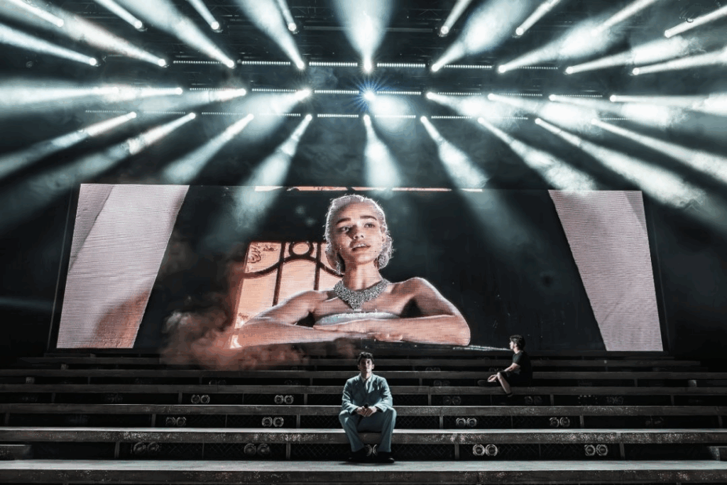 The set is stripped back, and yet the spectacle is immense. Echoing Lloyd’s 2019 Regents Park Open Air Theatre production, the set featured raised stairs, providing levels on which we could clearly see Fabian Aloise’s excellent choreography. Upstage, letters spelling out EVITA in big lights dazzled the audience. For the iconic balcony scene, which in this production is famously performed on the balcony of the London palladium to members of the public, is live streamed and projected into the theatre on a large screen that is lowered down at the start of Act 2. A special shout out must go to the lighting and sound design for this production. This was the best sounding West End show I have been to in a while, and the use of lighting created both spectacle and subtlety in different parts of the show, including the blinding lights on Zegler’s first entrance to her dwindling spotlight as she succumbs to her illness.